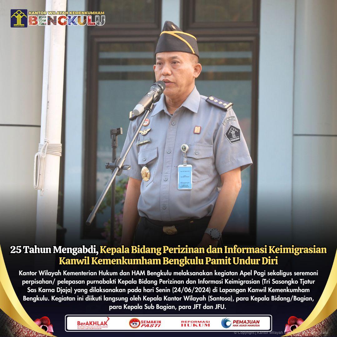 Bengkulu, jurnalisbengkulu.com – Kantor Wilayah Kementerian Hukum dan HAM Bengkulu melaksanakan kegiatan Apel Pagi sekaligus seremoni perpisahan/ pelepasan purnabakti Kepala Bidang Perizinan dan Informasi Keimigrasian (Tri Sasongko Tjatur Sas Karna Djaja) yang dilaksanakan pada hari Senin (24/06/2024) di Lapangan Kanwil Kemenkumham Bengkulu. Kegiatan ini diikuti langsung oleh Kepala Kantor Wilayah (Santosa), para Kepala Bidang/Bagian, para Kepala Sub Bagian, para JFT dan JFU.