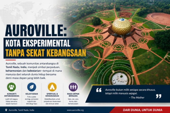 Tamil Nadu, India — Sebuah kota eksperimental bernama Auroville terus menarik perhatian dunia sebagai model komunitas internasional yang mengedepankan kehidupan kolektif dan harmoni lintas budaya. Kota ini terletak di wilayah Tamil Nadu, India, dan didirikan pada 28 Februari 1968 oleh Mirra Alfassa, yang dikenal sebagai “The Mother”.