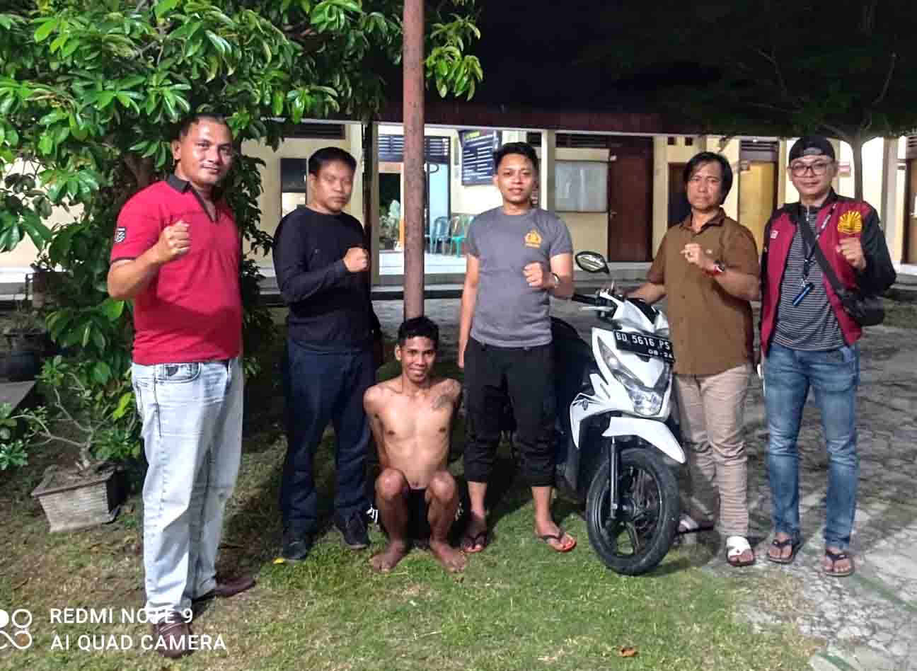 ” Pelaku ini mencuri motor milik salah satu warga yang sedang berbelanja di toko. Berdasarkan laporan korban akhirnya tersangka berhasil kita amankan di kawasan Kelurahan Beringin Raya bersama dengan motor yang dicuri,” sampai Kapolsek.