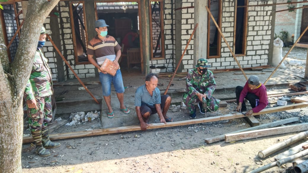 Pati – Sertu Supeno yang tergabung dalam satgas TMMD membantu warga bernama Iskandar (45) warga Desa Tamansari, Kecamatan Jaken, Kabupaten Pati.dalam menyambung kayu untuk kuda-kuda atap rumah Asmuri penerima bantuan Rumah Tidak Layak Huni Program TMMD Reguler Ke – 111 warga Desa Tamansari Rt 01 Rw 01. Minggu (20/06/2021).