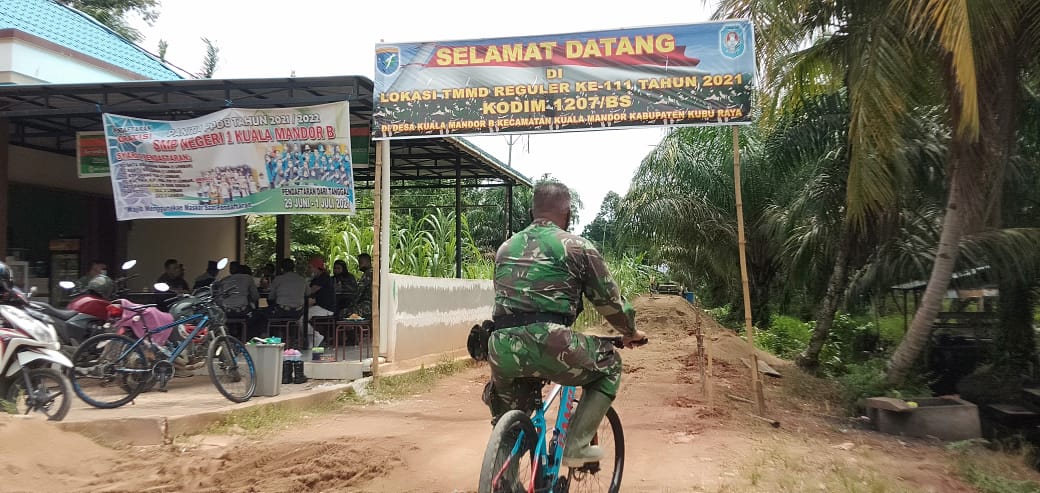 Kubu Raya – Pelaksanaan TMMD ke-111 Kodim 1207 Pontianak yang akan segera selesai, DanSST satgas TMMD ke-111 Kodim 1207/Pontianak (Kapten Arm Tri Yuliantoro) mengecek pekerjaan fisik sambil berolahraga dengan menggunakan sepeda, Minggu (11/07/2021).