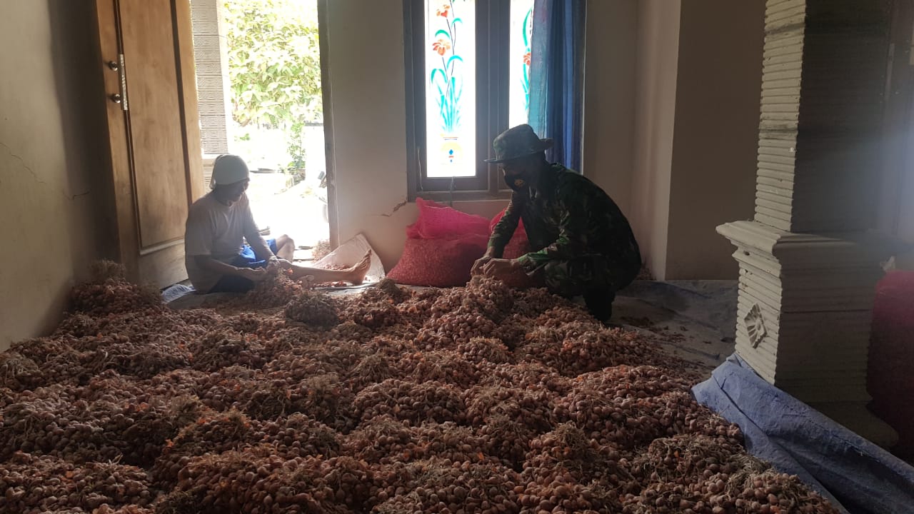 Serda Sukarji tertarik dan penasaran ketika melihat di salah satu rumah warga ada tumpukan bawang merah dan terlihat ada orang yang sedang membersihkan daun bawang merah tersebut. Ia berpikir ternyata didesa ini ada petani bawang merah. (0718)