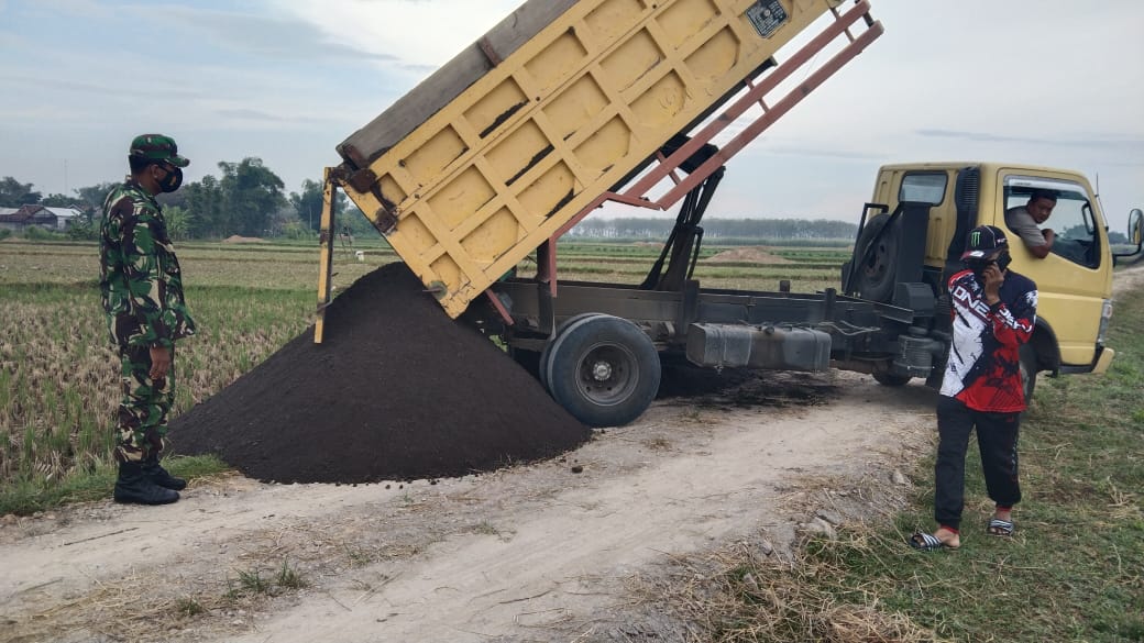 Salah satu tugas sertu Sumarno anggota satgas TMMD kodim Pati adalah melaksanakan pengecekan dan penempatan droping material di titik-titik yang tepat sehingga nantinya tidak mengulang atau bekerja dua kali.