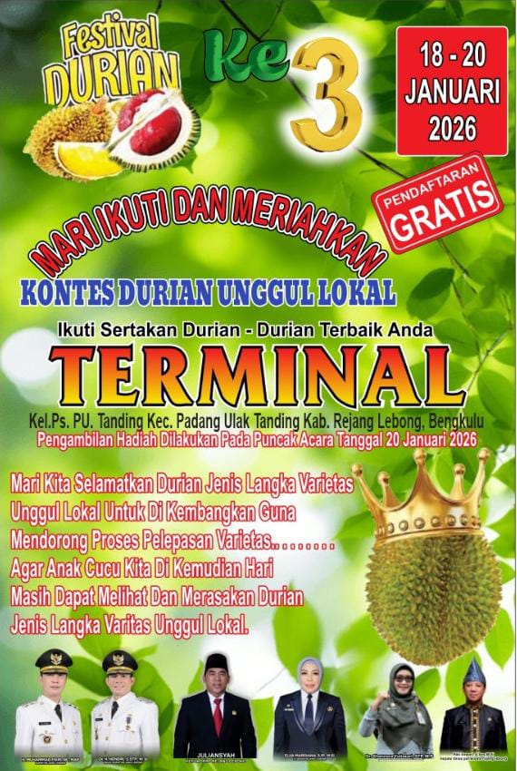 Rejang Lebong, Jurnalisbengkulu.com – Yayasan Lingkungan Hidup Semangat Bersama bekerja sama dengan Pemerintah Daerah Kabupaten Rejang Lebong, Provinsi Bengkulu, akan menggelar Festival Durian Jenis Langka Varietas Unggul Lokal ke-3 pada 18–20 Januari 2026. Kegiatan ini akan dipusatkan di Terminal Pasar Kelurahan Pasar Padang Ulak Tanding, Kabupaten Rejang Lebong.