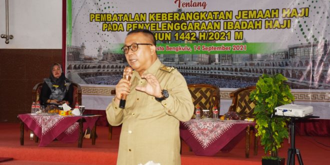 KOTA BENGKULU, jurnalisbengkulu.com – Menindaklanjuti Keputusan Menteri Agama Nomor 660 tahun 2021 tentang pembatalan keberangkatan jamaah haji pada penyelenggaraan ibadah haji tahun 2021, Pemerintah Kota (Pemkot) Bengkulu diwakili Plt Asisten I Eko Agusrianto, Kabag Kesra Eka Suniarti serta Ketua FKUB Yul Kamra melakukan pemahaman atau sosialisasi kepada sejumlah calon jemaah haji di Hotel Vista, Bengkulu Selasa (14/9/2021).