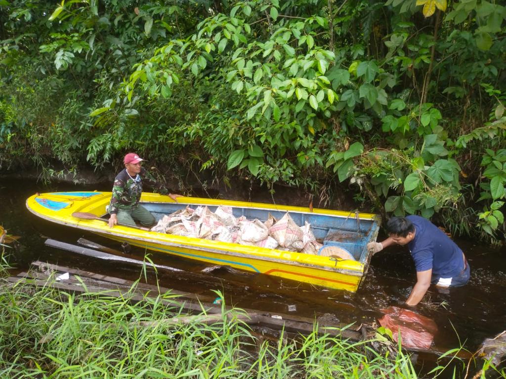 Kubu Raya – Karena sulitnya medan yang dilalui untuk mencapai titik sasaran fisik pada kegiatan TMMD ke-111 Kodim 1207/Pontianak, anggota satgas terpaksa menggunakan fasilitas seadanya seperti sampan untuk mengangkut material dengan menggunakan jalur air, Senin (12/07/2021).