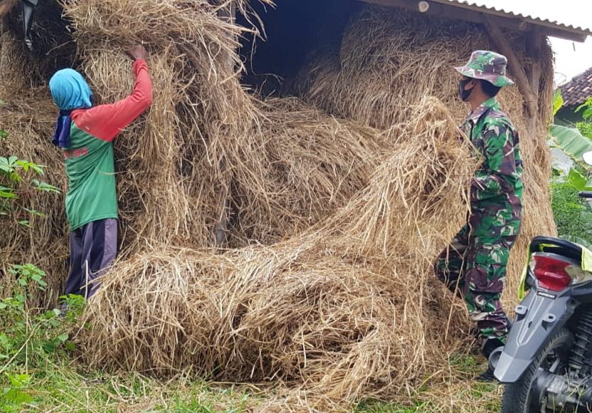 Pati – Serda Sukarji anggota Satgas TMMD Reguler ke-111 Kodim Pati merasa tertarik saat melihat salah satu warga sedang menumpuk jerami kering yang diambil dari sawah. Dengan tanpa rasa canggung Sukarji pun membantunya untuk menumpuk jerami kering tersebut, Senin (21/6/2021)