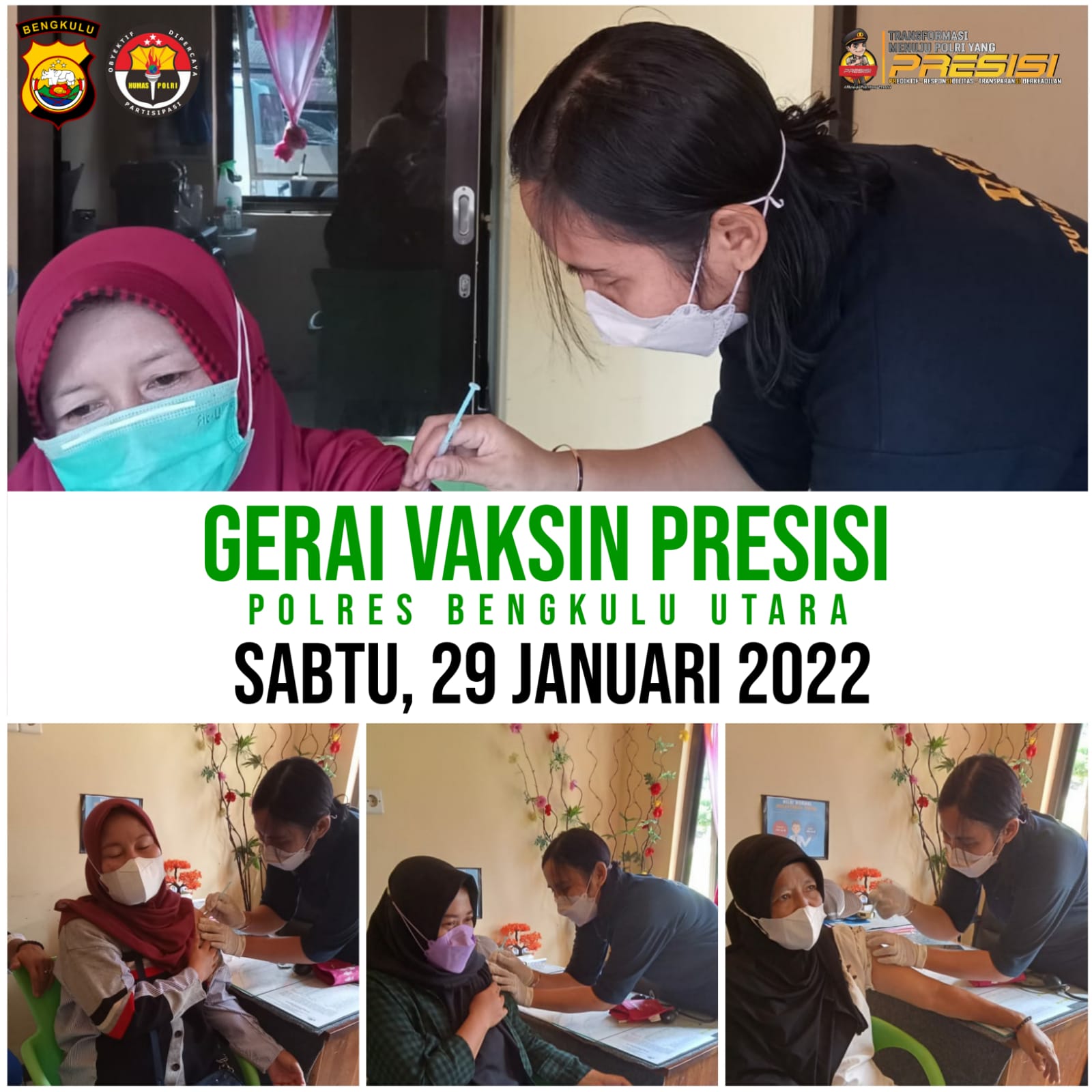 Kapolres Bengkulu Utara AKBP Andy Pramudya Wardana, S.I.K, M.M, hari ini (30/01/22) mengungkapkan, hal ini dilakukan pihaknya guna mempercepat pencapaian vaksinasi khususnya di Kabupaten BU sehingga penanggulangan penyebaran virus covid 19 dapat segera diatasi.(**)