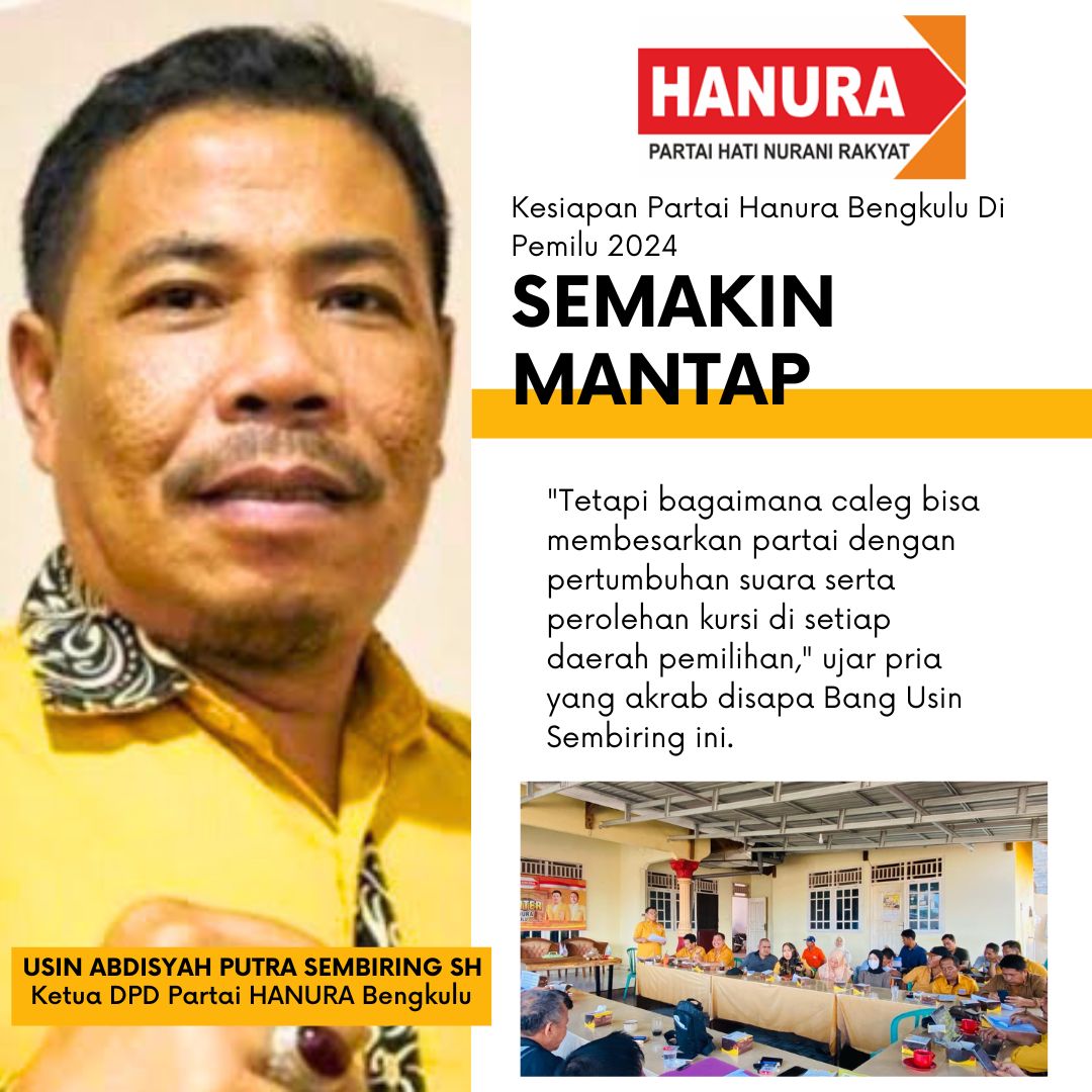 Dikatakan Ketua DPD Parta HANURA Provinsi Bengkulu, Usin Abdisyah Putra Sembiring SH, pada prinsipnya, demokrasi bukan hanya jargon di internal partai HANURA, tetapi mekanisme pelibatan usulan dari bawah, transparansi serta objektivitas dalam penjelasan dengan rencana capaian suara setiap caleg serta loyalitas caleg kepada partai tidak pernah ada dengan ukuran uang atau modal.