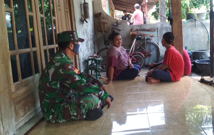 Seperti dalam kegiatan kali ini, Sertu Karyono anggota Satgas TMMD komunikasi sosial dengan ibu-ibu warga Dukuh Kemiri, Desa Tamansari, Kecamatan Jaken, Kabupaten Pati, sembari memberikan himbauan dan penertiban protokol kesehatan, Selasa (15/6/2021)