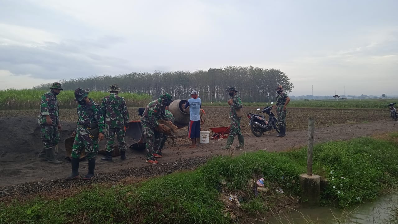 Pati – Pembangunan jalan penghubung amtara Desa tamansari dan Desa Sumberarum Kec.Jaken Kab. Pati sudah masuk tahap pengecoran yang sampai dengan saat ini masih berlangsung. Dengan sangat bersemangat Para Satgas TMMD beserta masyarakat dalam melaksanakan proses pengerjaan pengecoran di bantu dengan alat angkong dan mesin Molen selain cangkul dan alat lainnya sehinggga menambah kemudahan dalam pengerjaannya dan penghematan waktu., selain dari pada itu di butuhkan suplai air yang cukup untuk proses pencampuran material Sabtu(19/06/2021).