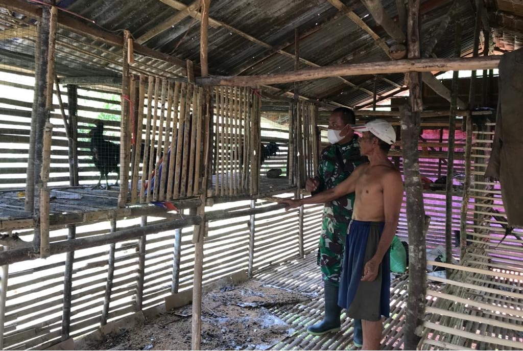 Kubu Raya – Salah seorang anggota satgas TMMD ke-111 Kodim 1207/Pontianak, Serda Sugeng R. tampak sedang mengunjungi kandang ayam kampung super milik warga yang berada di lokasi TMMD ke-111 Kodim 1207/Pontianak, Desa Kuala Mandor B, Kecamatan Kuala Mandor B, Kabupaten Kubu Raya, Minggu (11/07/2021).