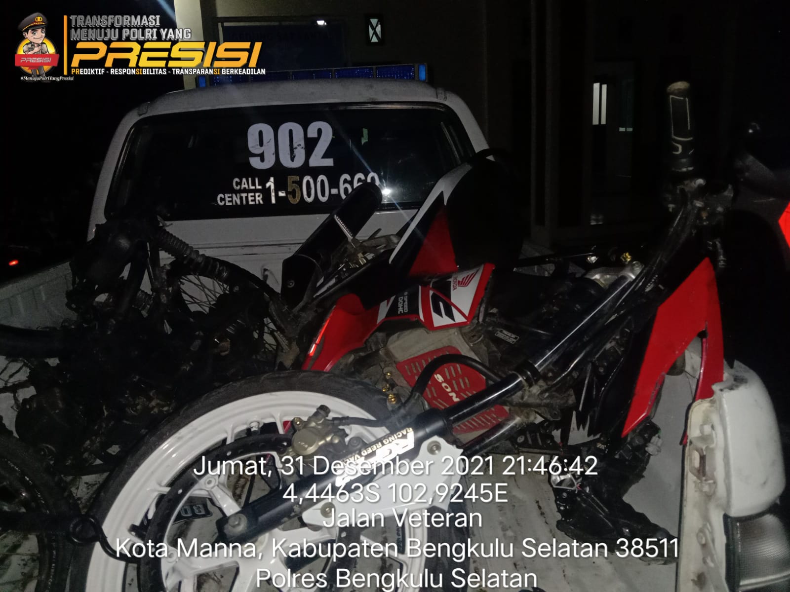 Untuk pemeriksaan lebih lanjut, kedua sepeda motor tanpa nomor polisi yang terlibat kecelakaan saat ini telah diamankan ke Polres Bengkulu Selatan pungkasnya sembari kembali memberikan himbauan agar seluruh elemen masyarakat dapat lebih meningkatkan kewaspadaan dan tertib saat berlalu lintas dengan menjadikan keselamatan sebagai kebutuhan.