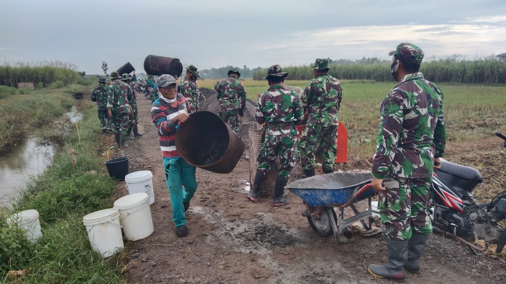 Pati – Partisipasi aktif Satgas TMMD dan seluruh warga Desa Tamansari,Kecamatan Jaken, Kabupaten Pati. dalam mendukung Program TNI Manunggal Membangun Desa (TMMD) 111 Kodim 0718/ Pati Seorang pria tua Maryono (61) warga Desa Tamansari RT 02 RW 01, tetap ikut kerja pengecoran jalan Desa Tamansari.