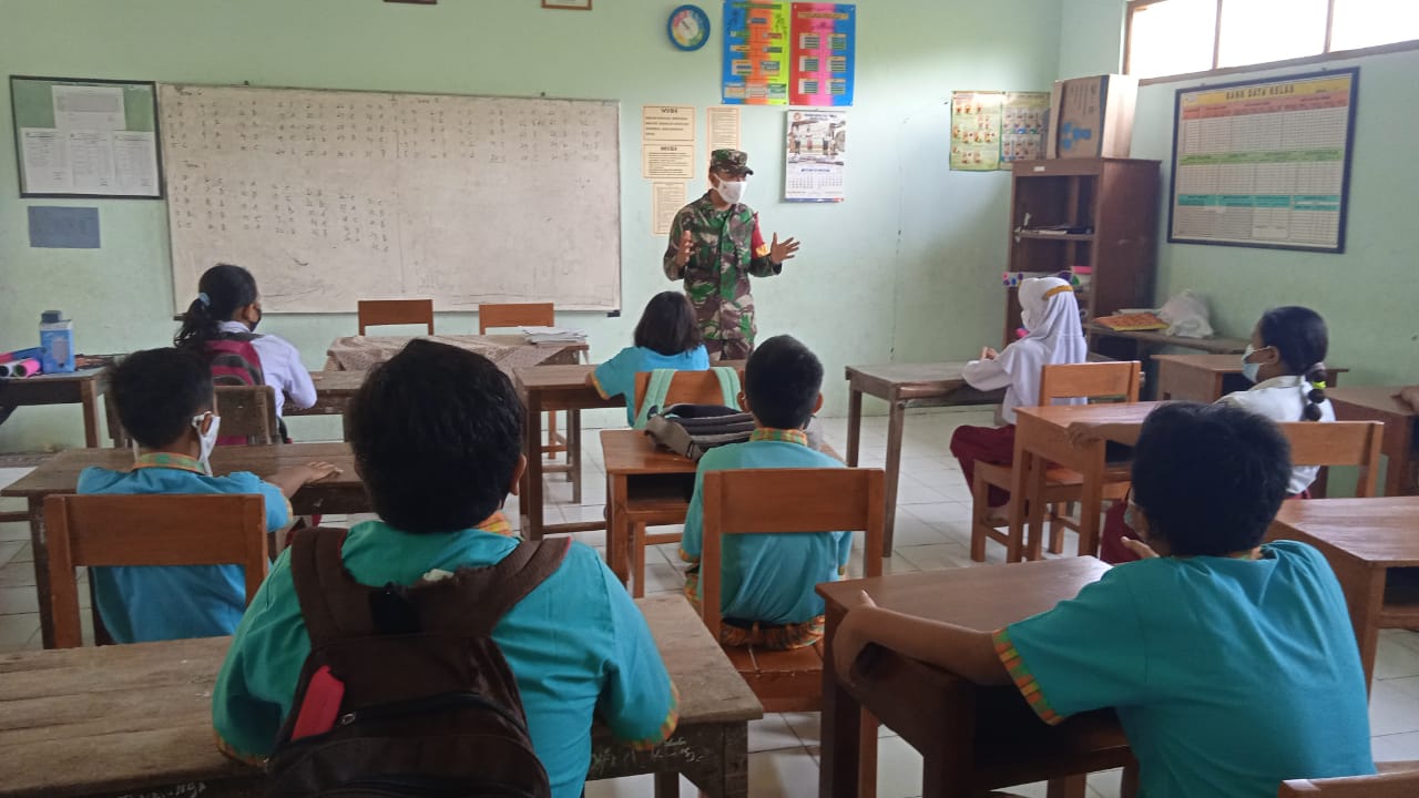 Pati – Tidak Cuma membangun fisik semata keberadaan Satgas TMMD di Desa Tamansari Kec, Jaken Kab.Pati tapi juga memberi edukasi moral serta memberi Ideologi wawasan kebangsaan juga tak kalah penting biar tumbuh rasa bangga menjadi warga Negara Kesatuan Republik Indonesia yang pada akhirnyanya nanti memupuk jiwa Patriotisme yang tinggi “Tutur Sertu Toha Untoro”.(Sabtu,12/06/2021).