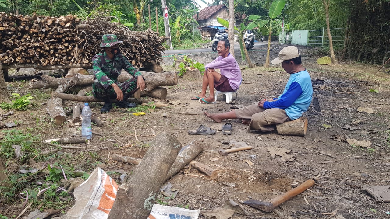 Pati – Anggota Satgas TMMD Reguler ke-111 Kodim 0718/Pati terus tingkatkan kepedulian serta membantu warga Desa Tamansari dalam berbagai kesempatan, diantaranya membantu warga membelah kayu untuk keperluan memasak didapur.