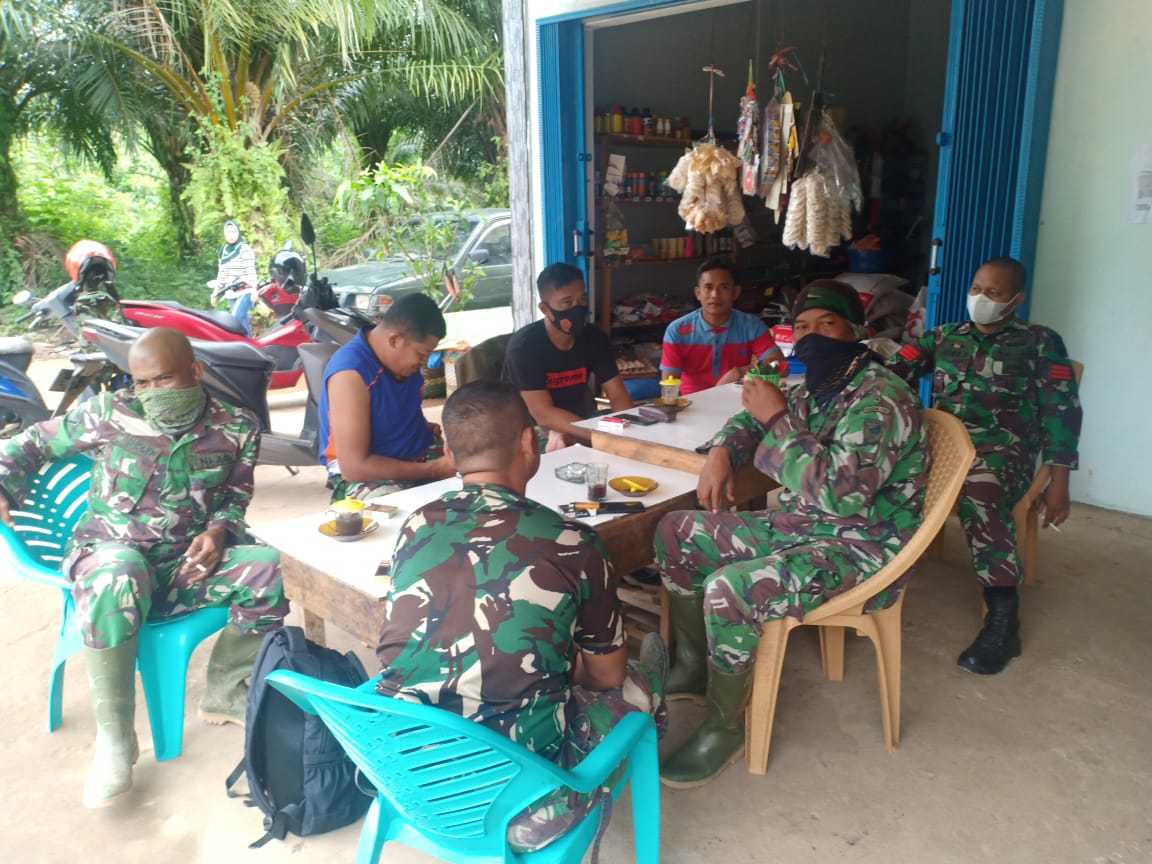 Sertu M. Soleh bersama satgas TMMD lainnya dan warga saling bercengkrama, bertukar pikiran dan berbagi pengalaman sembari menikmati kopi hitam.
