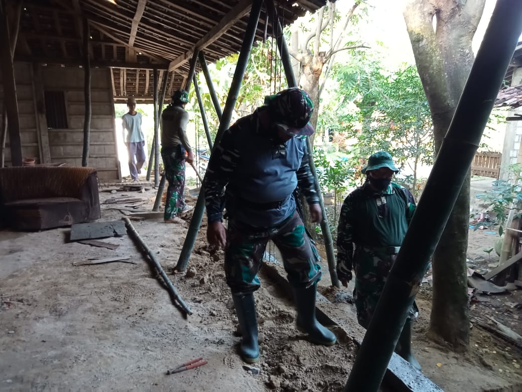 Sambil menunggu kesiapan material yang akan dipergunakan untuk membangun tembok rumah milik Asmuri , anggota Satgas TMMD Serda Rajio bersama warga sudah memasang tiang-tiang penopang atap agar tidak roboh.