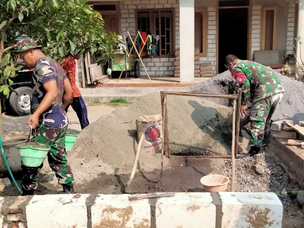 Koptu Asrob (36) bersama rekanya Satgas TMMD diberi tanggung jawab untuk menyiapkan adukan pasir untuk pemasangan pondasi rumah, mereka tetap semangat melaksanakan tugasnya, walau panas terik mengiringi pekerjaannya. Terlihat begitu trampil dan cekatan dalam membuat adonan takaran untuk adukan pasang pondasi. Dengan tangan dua yang kekar Sertu Saeri mengangkat ember adukan untuk melayani pemasangan pondasi.