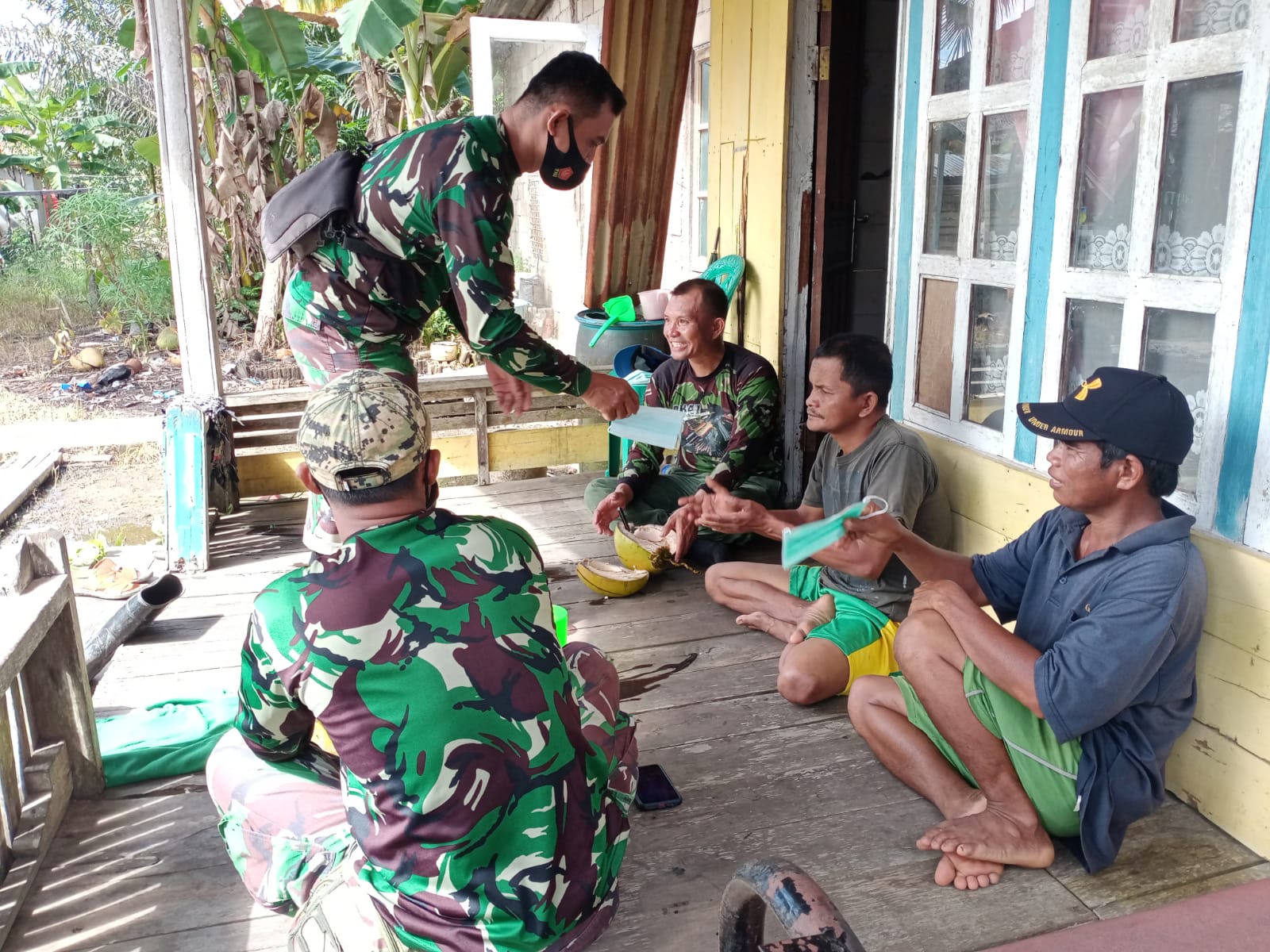 Kubu Raya – Anggota satgas TMMD ke-111 kodim 1207/Pontianak melakukan sosialisasi sekaligus membagikan masker secara gratis. Sosialisasi dan pembagian masker ini dilaksanakan disaat menemui masyarakat yang sedang berkumpul di teras rumah bapak Mat Ali warga Dusun Maju Jaya, Desa Kuala Mandor B, Kecamatan Kuala Mandor B, Kabupaten Kubu Raya, Minggu (11/07/2021).