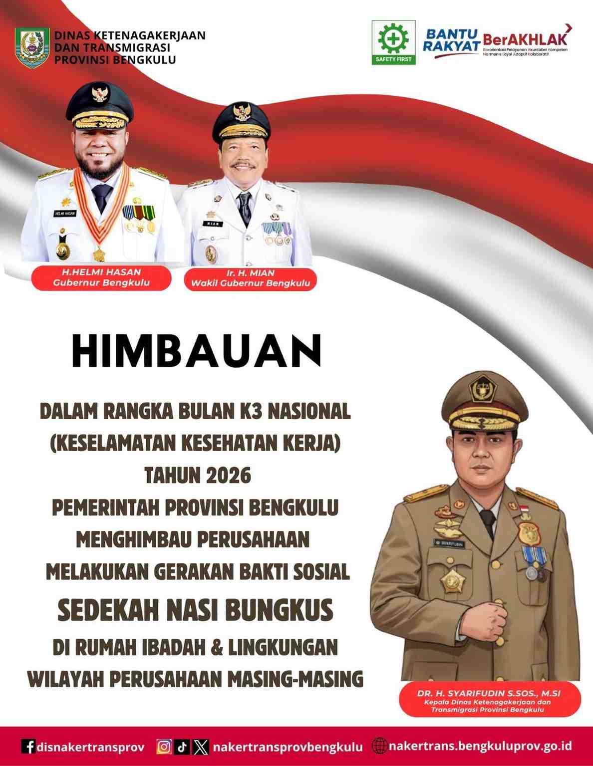Bengkulu, Jurnalisbengkulu.com – Pemerintah Provinsi Bengkulu melalui Dinas Ketenagakerjaan dan Transmigrasi mengeluarkan imbauan kepada seluruh perusahaan di wilayah Provinsi Bengkulu untuk berpartisipasi dalam gerakan bakti sosial Sedekah Nasi Bungkus, dalam rangka memperingati Bulan K3 Nasional (Keselamatan dan Kesehatan Kerja) Tahun 2026.