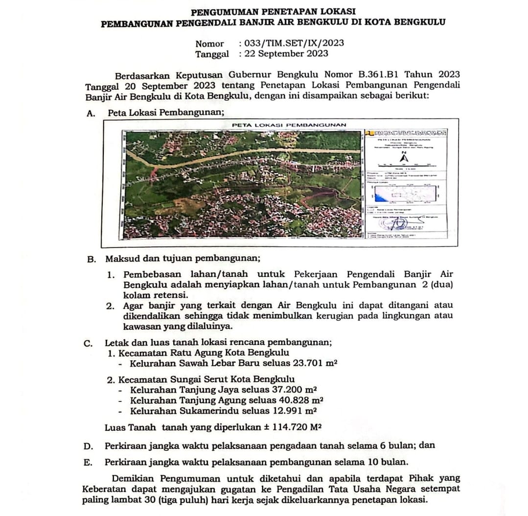 Bengkulu, jurnalisbengkulu.com – Pemerintah Provinsi (Pemprov) secara resmi umumkan Penetapan Lokasi Pembangunan Pengendali Banjir Air Bengkulu di Kota Bengkulu, berdasarkan Keputusan Gubernur Bengkulu Nomor B. 361.B1 Tahun 2023.