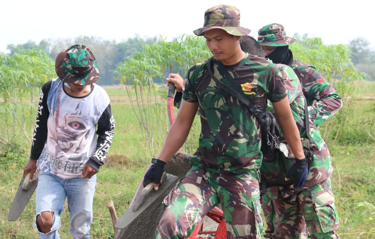 Pati – Serma Kasmuri salah satu anggota Satgas TMMD Reguler ke-111 Kodim Pati terlihat bersemangat menggerakkan alatnya dalam proses perataan adukan beton dalam pembangunan jalan sasaran fisik TMMD. Ia tidak merasakan teriknya matahari yang bersinar terang hari ini. Bersama anggota Satgas lainya bahu membahu meratakan adukan beton yang ditumpahkan dari alat angkong, Selasa (22/6/2021)