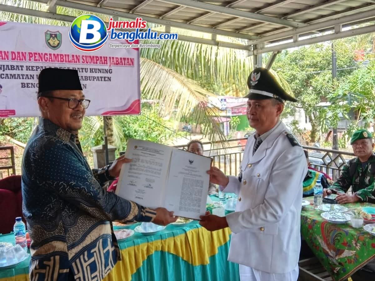 Bengkulu Selatan, Jurnalisbengkulu.com – Pemerintah Kabupaten Bengkulu Selatan kembali melakukan penyegaran kepemimpinan di tingkat desa. Sekretaris Daerah, Ir. Susmanto, M.M., secara resmi melantik Suplimin, SKM sebagai Pejabat Sementara (Pjs) Kepala Desa Batu Kuning, Kecamatan Ulu Manna, dalam sebuah prosesi yang berlangsung di Balai Desa Batu Kuning, Kamis (09/04/2026).