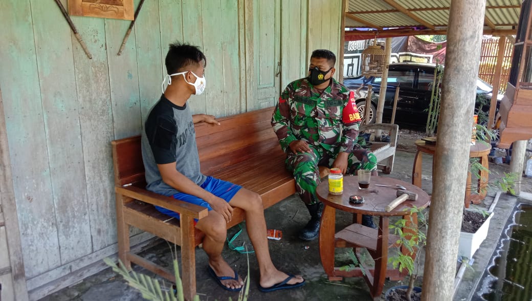 Pati – Koptu Siswanto salah seorang anggota Satgas TMMD Reguler Ke-111 Kodim 0718/Pati, melaksanakan kegiatan komunikasi sosial (komsos) di rumah Widodo (42) di Dusun Pandahan, Desa Tamansari, Kecamatan Jaken, Kabupaten Pati, Kamis (17/6/2021).