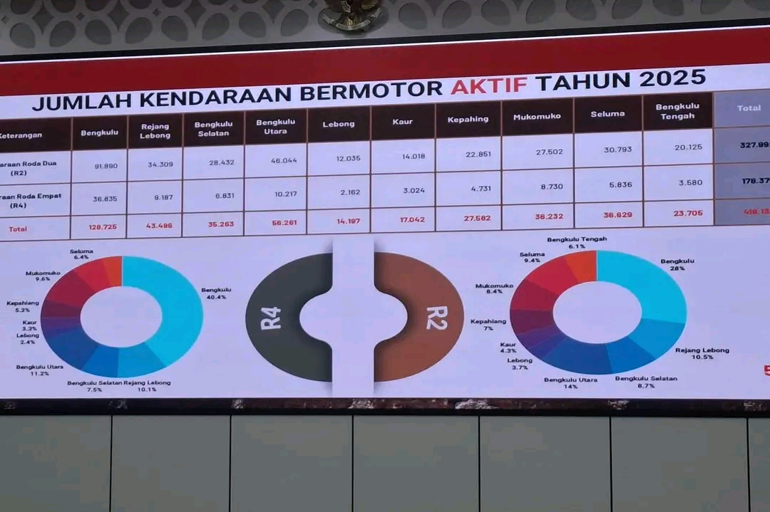 Dari total 1.297.250 unit kendaraan bermotor yang tercatat, hanya sekitar 419.132 unit atau 32 persen yang tercatat aktif membayar pajak. Mayoritas kendaraan didominasi roda dua dengan sebaran tertinggi berada di Kota Bengkulu, disusul Kabupaten Rejang Lebong dan Bengkulu Utara. Kondisi ini menunjukkan masih besarnya potensi pajak yang belum tergarap maksimal.
