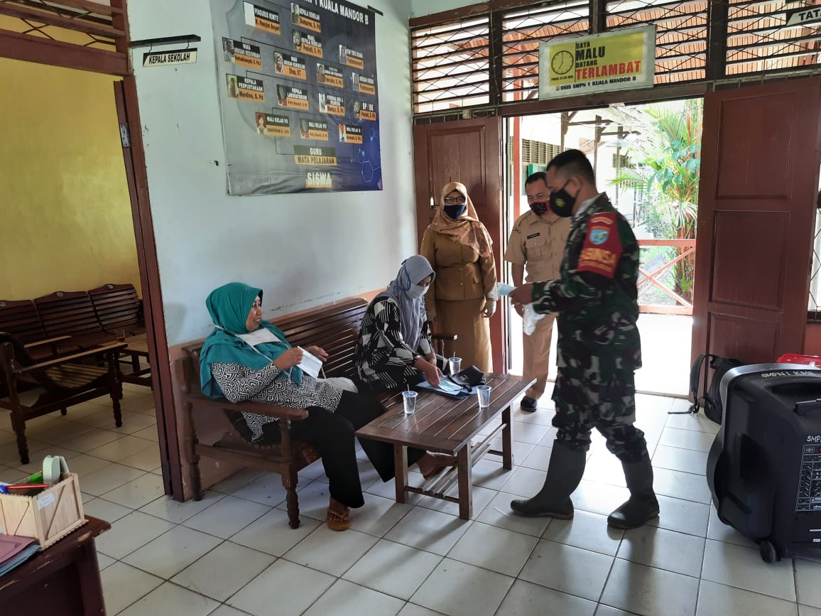 SMP Negeri 1 Kuala Mandor B, Kabupaten Kubu Raya merupakan lokasi TMMD ke-111 Kodim 1207/Pontianak. Disela-sela tugasnya sebagai satgas TMMD, bapak Babinsa ini sambangi SMP Negeri 1 Kuala Mandor B yang merupakan wilayah binaannya. Sambil bergurau sebagai ciri kas dirinya, bapak Babinsa ini membagikan masker untuk warga SMP Negeri 1 Kuala Mandor B.