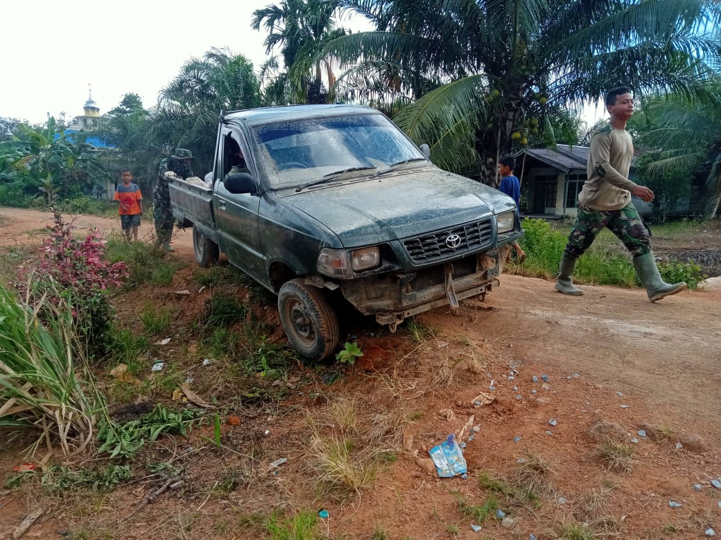 Kubu Raya – Mobil Pickup pengangkut material tergelincir di lokasi TMMD ke-111 Kodim 1207/Pontianak yang berada di Dusun Maju Jaya, Desa Kuala Mandor B, Kecamatan Kuala Mandor B, Kabupaten Kubu Raya, Minggu (11/07/2021).