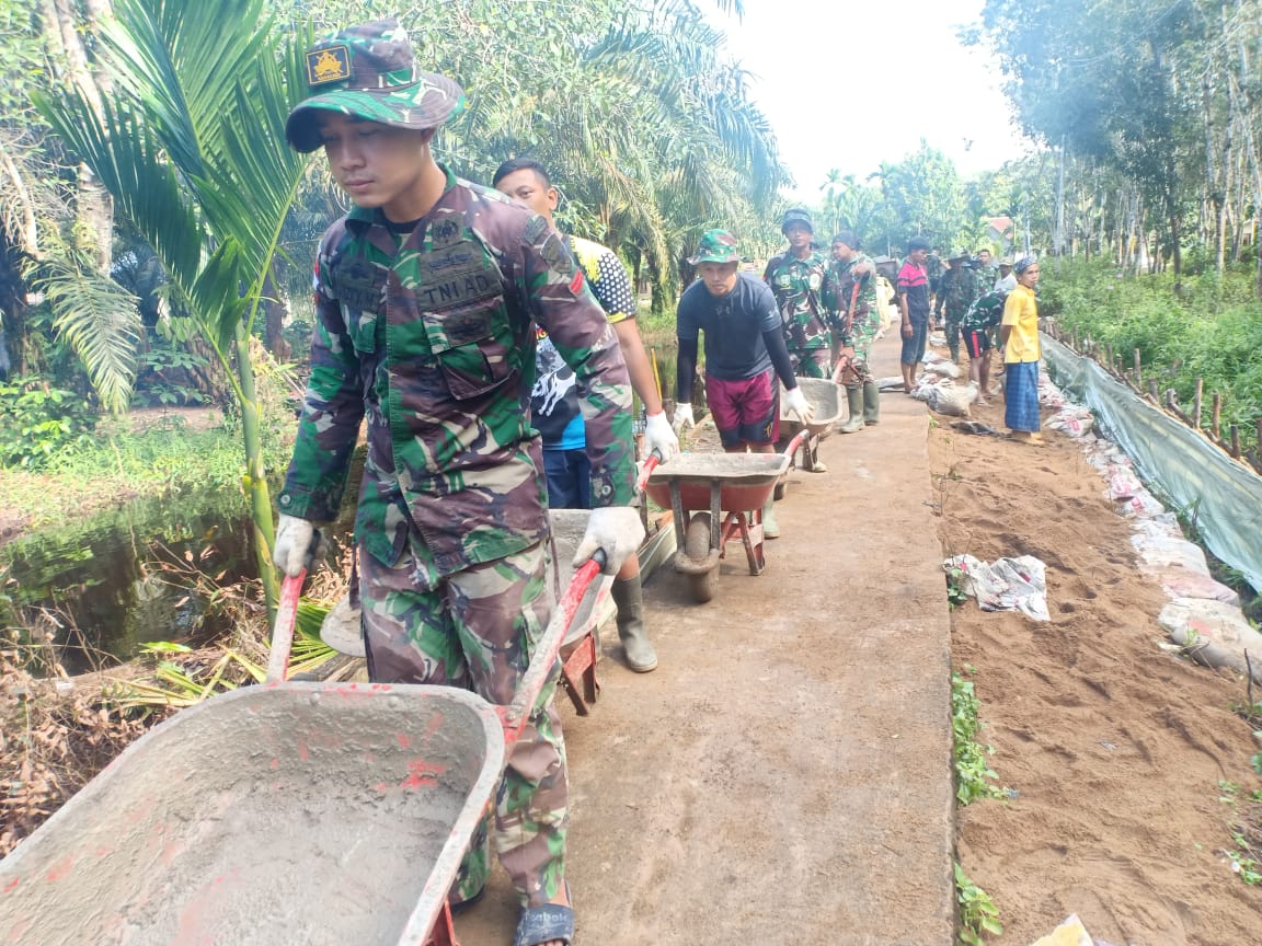 Kubu Raya – Satgas TMMD ke-111 Kodim 1207/Pontianak melaksanakan gotong royong pengecoran jalan bersama masyarakat Desa Kuala Nandor B, Kecamatan Kuala Mandor B, Kabupaten Kubu Raya, Jumat (09/07/2021).