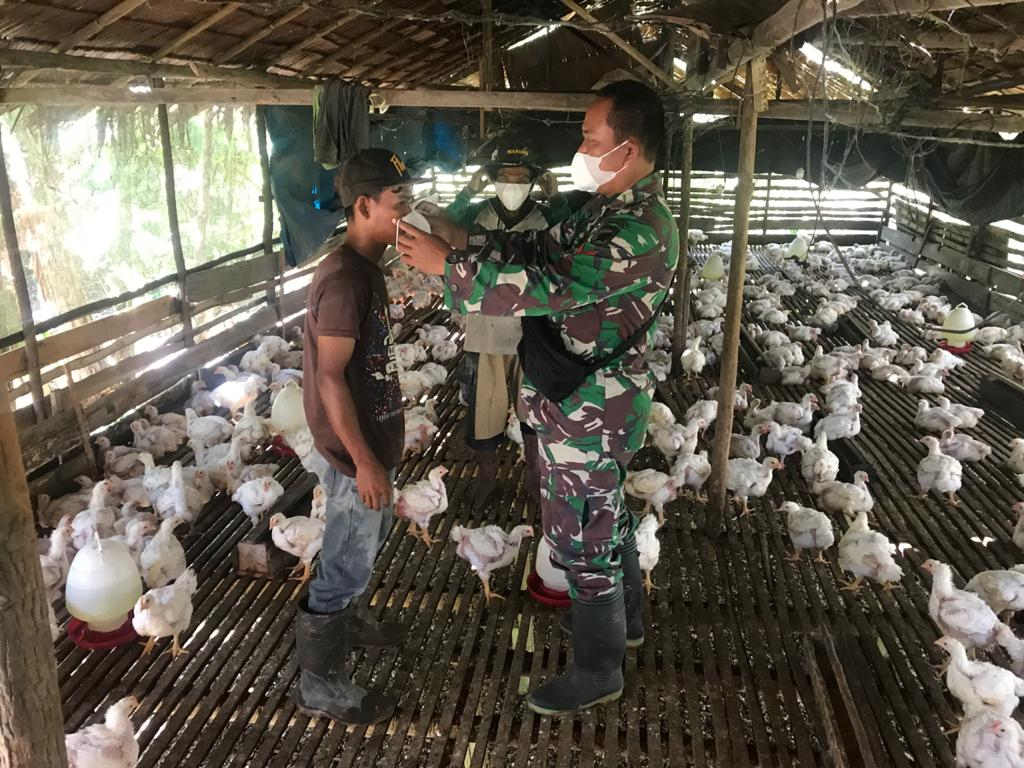 Saat mengunjungi seorang peternak ayam yang tinggal di sekitar lokasi TMMD, anggota satgas memberikan 1 masker gratis ke peternak ayam yang sedang tidak menggunakan masker. Selain itu anggota satgas juga memberikan edukasi kepada peternak ayam tentang manfaat masker dan pentingnya menerapkan protokol kesehatan di lingkungan rumah.
