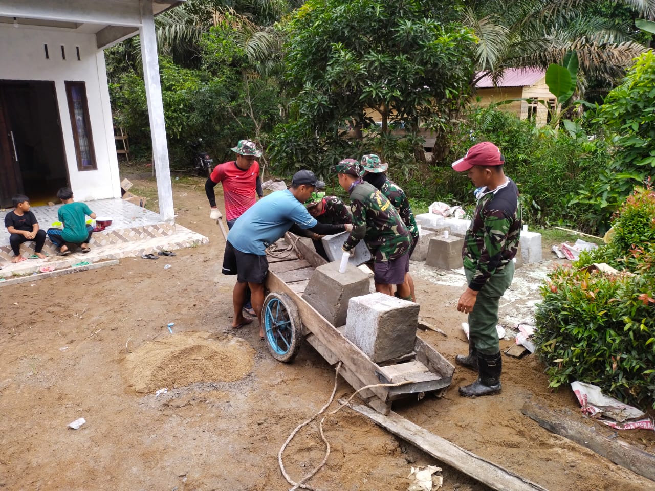 Terlihat kompak disaat personil TNI dan masyarakat bersama-sama mendorong gerobak untuk mendistribusikan landasan tiang bendera ke rumah warga.