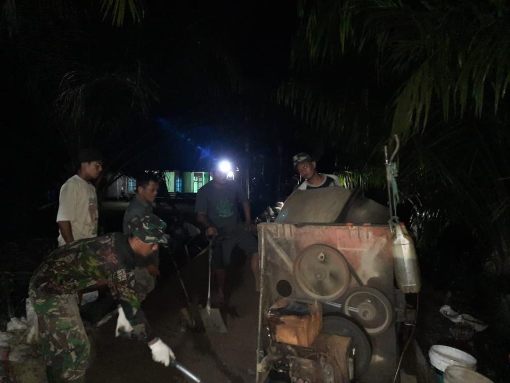 Seperti halnya saat siang itu, ketika anggota satgas TMMD bersama warga sekitar sedang bekerja, tiba-tiba saja hujan turun sangat deras. Semua kegiatan pengecoran jalan dihentikan sementara. Namun saat malam hari perlahan-lahan hujan mulai reda, walaupun masih sedikit gerimis anggota satgas TMMD dan warga tetap malanjutkan pekerjaan pengecoran jalan yang tertunda di siang hari. Mereka saling bahu membahu bekerja untuk mengejar target, mengingat waktu pelaksanaan TMMD yang hanya 30 hari.
