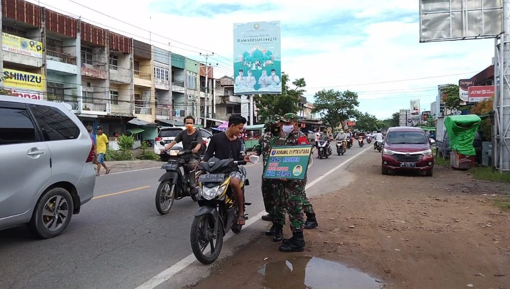 Kubu Raya – Satgas TMMD ke-111 Kodim 1207/Pontianak menghentikan para pejalan kaki dan pengendara sepeda motor yang tidak menggunakan masker disepanjang jalan yang sedang beraktifitas di luar rumah, Rabu (23/06/2021).