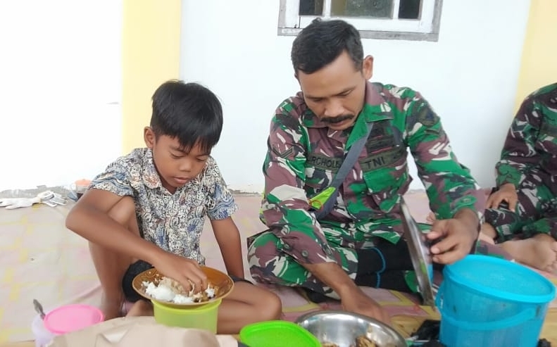 “Saya senang melihat bocah ini makan bersama kami mau membaur, terkadang ada juga yang tidak mau” ucap Serda Nurcholis.
