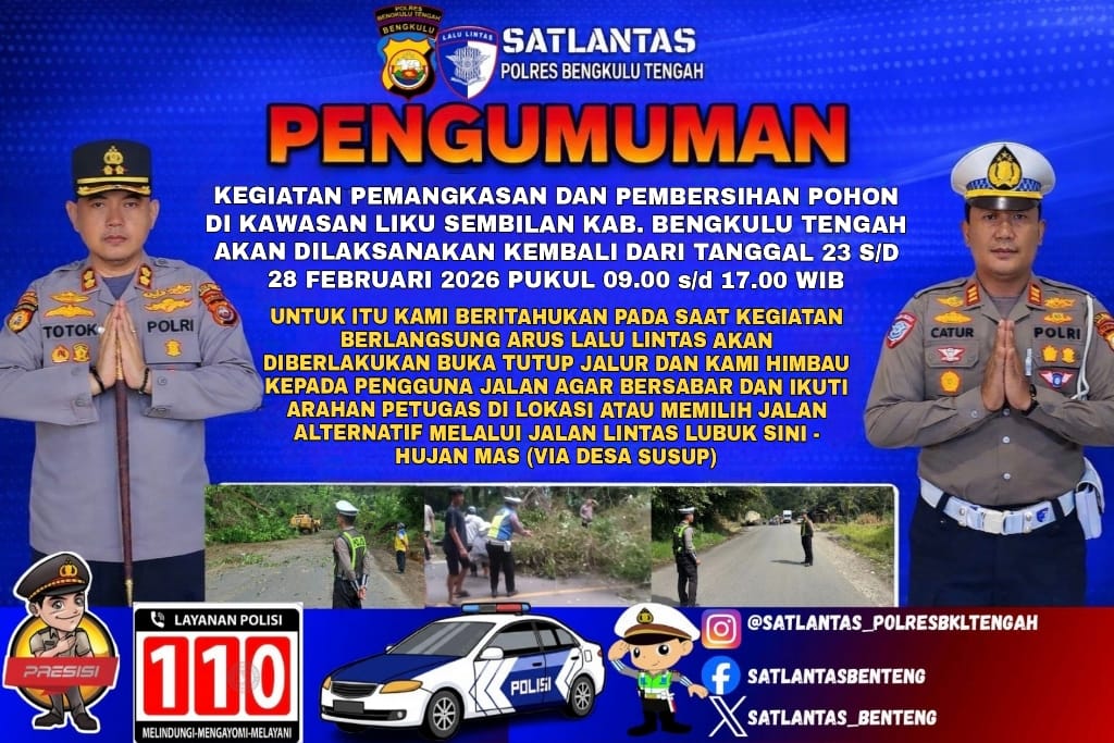 Bengkulu Tengah, Jurnalisbengkulu.com – Satuan Lalu Lintas (Satlantas) Polres Bengkulu Tengah mengumumkan pelaksanaan kegiatan pemangkasan dan pembersihan pohon di kawasan Liku Sembilan, Kabupaten Bengkulu Tengah. Kegiatan tersebut dijadwalkan berlangsung pada 23 hingga 28 Februari 2026, mulai pukul 09.00 WIB hingga 17.00 WIB.