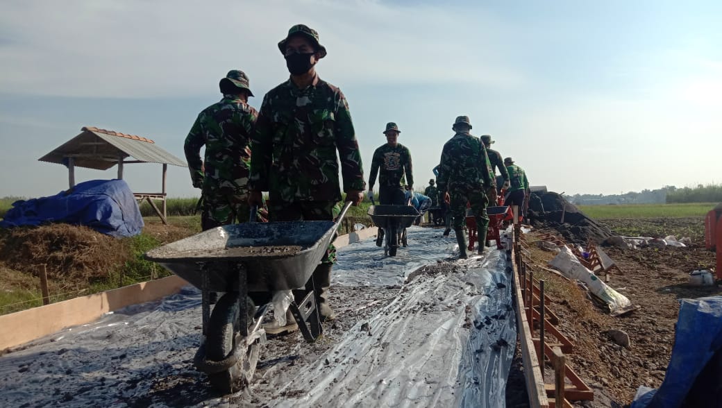 Pati – Program TMMD reguler Ke-111 Kodim 0718/Pati di Desa Tamansari, Kecamatan Jaken, Kabupaten Pati sudah memasuki tahap pengecoran jalan sudah mulai di dikerjakan hari ini bersama-sama dengan warga Desa Tamansari penuh semangat mengawali pagi sejuk dan cerah secara bergantian membawa aduan cor ke tempatnya. (17/06/2021)