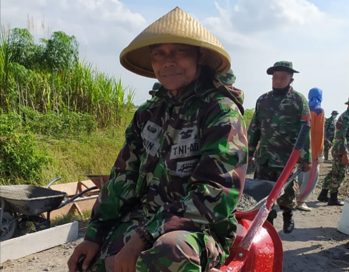 Pati – Tidak ada kata mengeluh bagi TNI satu ini, Dialah Sertu Imron anggota Koramil 12/Margorejo yang ikut tergabung dalam Satgas TMMD Reguler ke-111 Kodim Pati yang saat ini masih fokus dalam pengerjaan sasaran fisik TMMD yakni pengecoran jalan pertanian warga Desa Tamansari, Kecamatan Jaken, Kabupaten Pati, Jawa tengah.