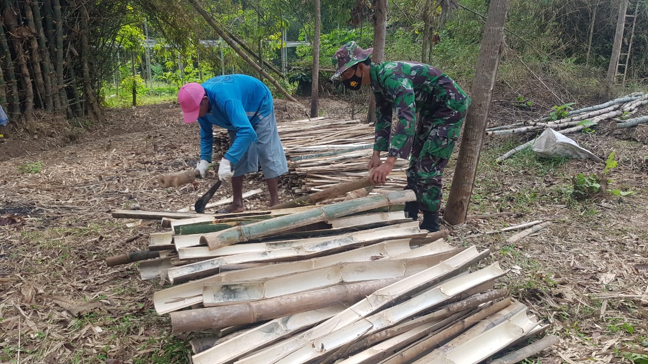 Terlihat Suwarjo bersama Serda Sukarji anggota Satgas TMMD Reguler Kodim Pati sedang mempersiapkan bilah – bilah bambu yang akan dipergunakan untuk lanjaran tanaman kacang panjang, Senin (21/6/2021)