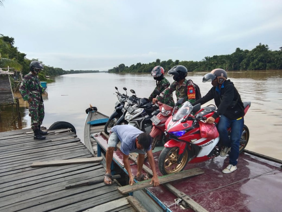 Nampak satgas TMMD yang sedang memanfaatkan angkutan motor air dengan menyertakan kendaraan roda dua untuk menuju lokasi sasaran pengerjaan TMMD. Meski cukup menantang, namun inilah yang harus dihadapi, hanya ada satu pilihan untuk terus maju membantu masyarakat mengerjakan pembangunan di lokasi TMMD ke-111 Kodim 1207/Pontianak.