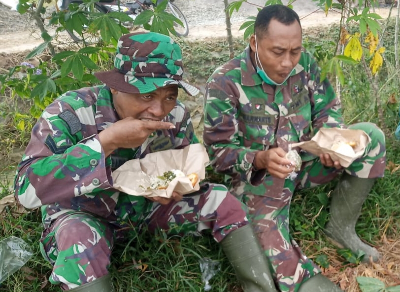 Dua orang TNI anggota Satgas TMMD, Sertu Warsidi dan Serda Darmanto terbidik camera ponsel media, sedang menikmati sarapan pagi berupa nasi bungkus. Walaupun dengan menu sederhana, oseng kacang panjang dan terlur dadar mereka berdua tampak menikmatinya, Senin (21/6/2021).