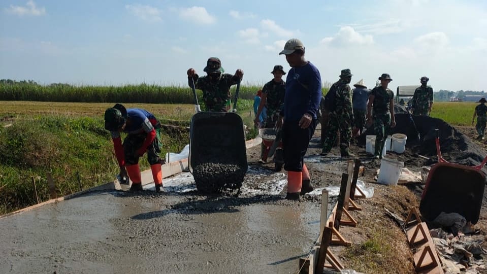 Pati – Kebersamaan yang dilakukan oleh anggota satgas TNI Manunggal Membangun Desa ( TMMD ) Reguler ke – 111 Kodim 0718/Pati dengan warga Desa Tamansari Kecamatan Jaken Kabupaten Pati, di pekerjaannya dalam pembangunan fisik pengecoran jalan betonisasi perlu diacungi jempol, Sabtu (19/06/2021).