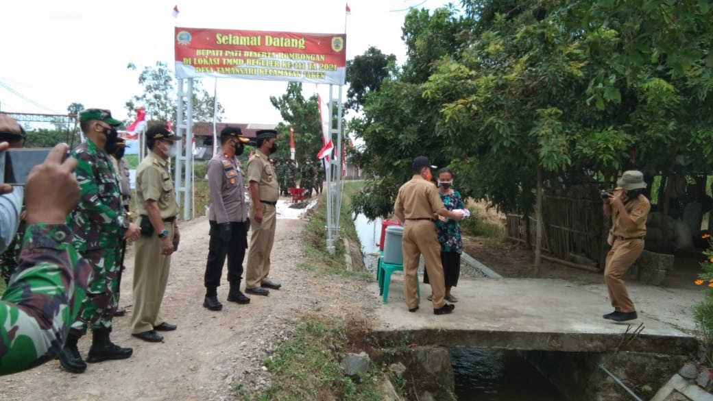 Pati – Program Tentara Manunggal Membangun Desa (TMMD) Reguler ke 111 th 2021 Kodim 0718/Pati yang Baru saja di buka oleh Bupati pati ,Tidaklah menunggu lama Bupati Pati bersama FORKOPINDA Pati langsung melaksanakan peninjauan ke lokasi di mana TMMD berlangsung di mulai dari peninjauan Jalan Penghubung Antara Desa Tamansari dan Desa Sumberarum Sepanjang 1.450 M dan lokasi yang berbeda peninjauan terhadap 16 rumah RTLH yang akan di renofasi serentak .Rabu(16/06/2021).