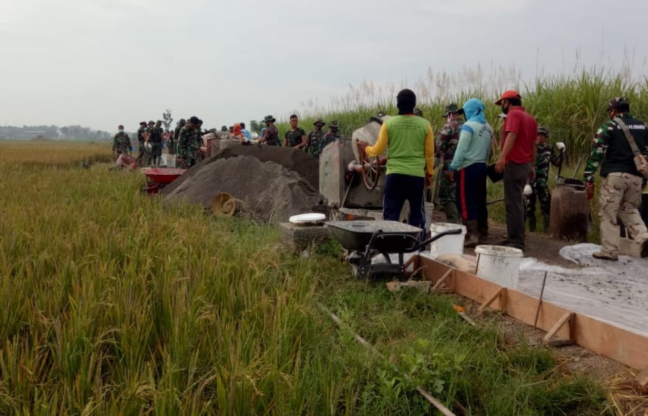 Pati-Kegiatan betonisasi jalan sepanjang 1450 meter telah dimulai seiring dibukanya TMMD Reguler 111 Kodim Pati oleh Bupati Haryanto tanggal 15 Juni 2021 seminggu lalu.