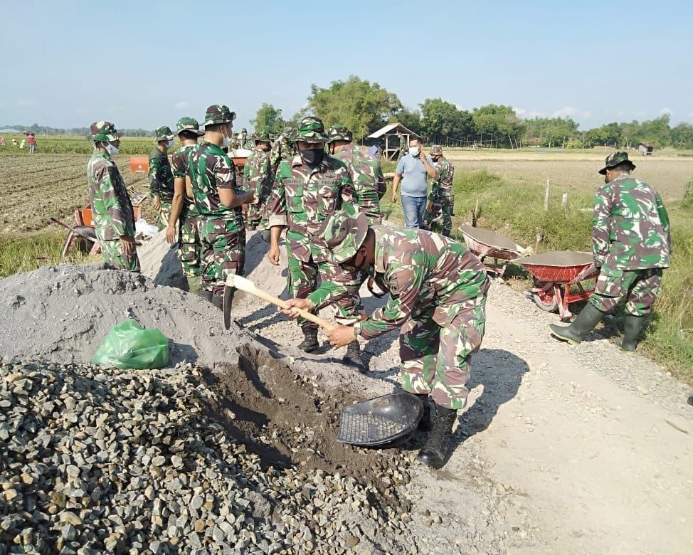 Pati – Anggota Satgas TNI dari kodim Pati dan masyarakat Desa Tamansari, Kecamatan Jaken, Kabupaten Pati, telah menuju ke lokasi TMMD reguler ke 111 TA. 2021 untuk melangsir dan mengangkat pasir, batu split, untuk melanjutkan pelaksanaan ‘pengecoran jalan supaya tidak terjadi keterlambatan bahan yang di aduk untuk pengecoran dan mendapatkan hasil yg maksimal, Senin(21/06).