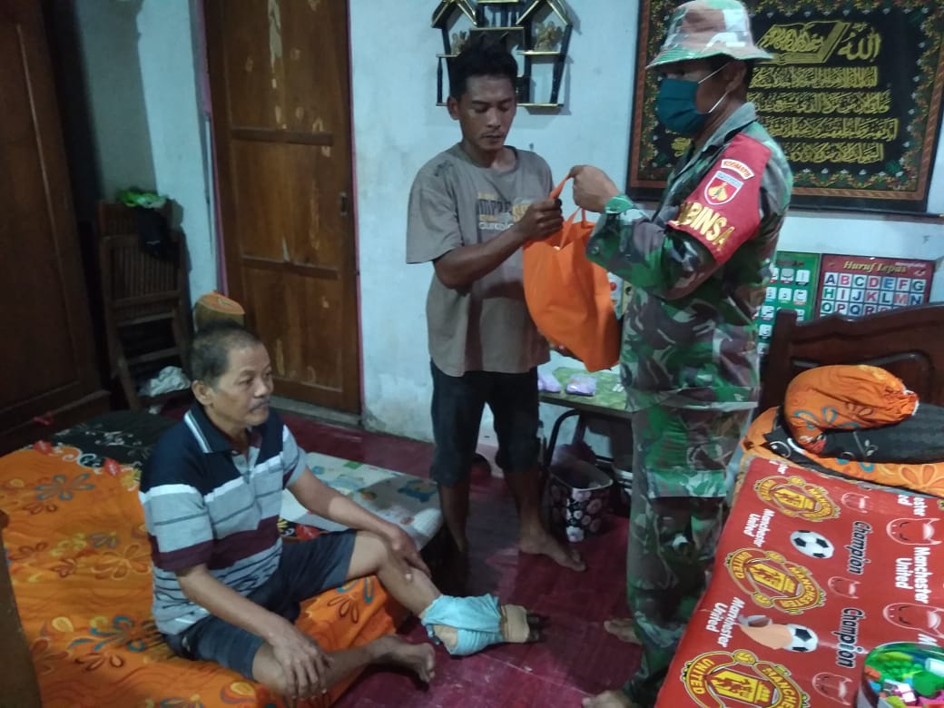 Wujud kepedulian warga yang terdampak pandemi Covid-19, Kodim Pati membagikan bingkisan sembako untuk meringankan beban mereka. Salah satunya Mat Turi (62) warga Desa Tamansari sedang menderita penyakit diabetes akut, diberikan bingkisan yang serahkan oleh Satgas TMMD, Sertu M. Agil, Sabtu (19/6/2021).