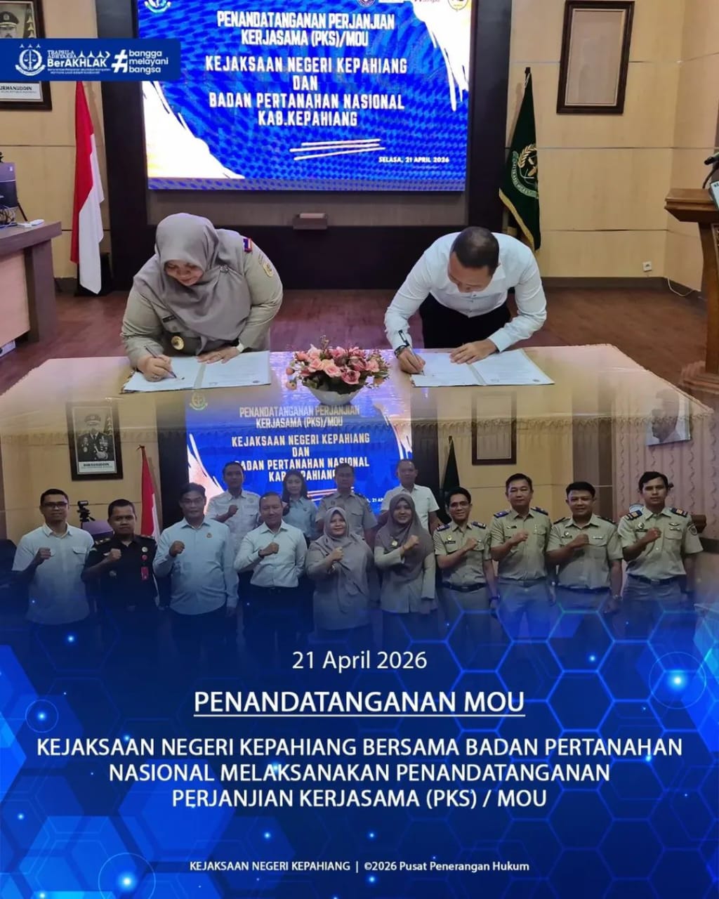 Kepahiang, Jurnalisbengkulu.com — Kepala Kejaksaan Negeri Kepahiang, Bagus Nur Jakfar Adi Saputro, S.H., M.H., bersama jajaran kepala seksi (Kasi) dan kepala subseksi (Kasubsi) melaksanakan penandatanganan Perjanjian Kerja Sama (PKS) atau Memorandum of Understanding (MoU) dengan Badan Pertanahan Nasional (BPN) Kabupaten Kepahiang, Selasa (21/4/2026).